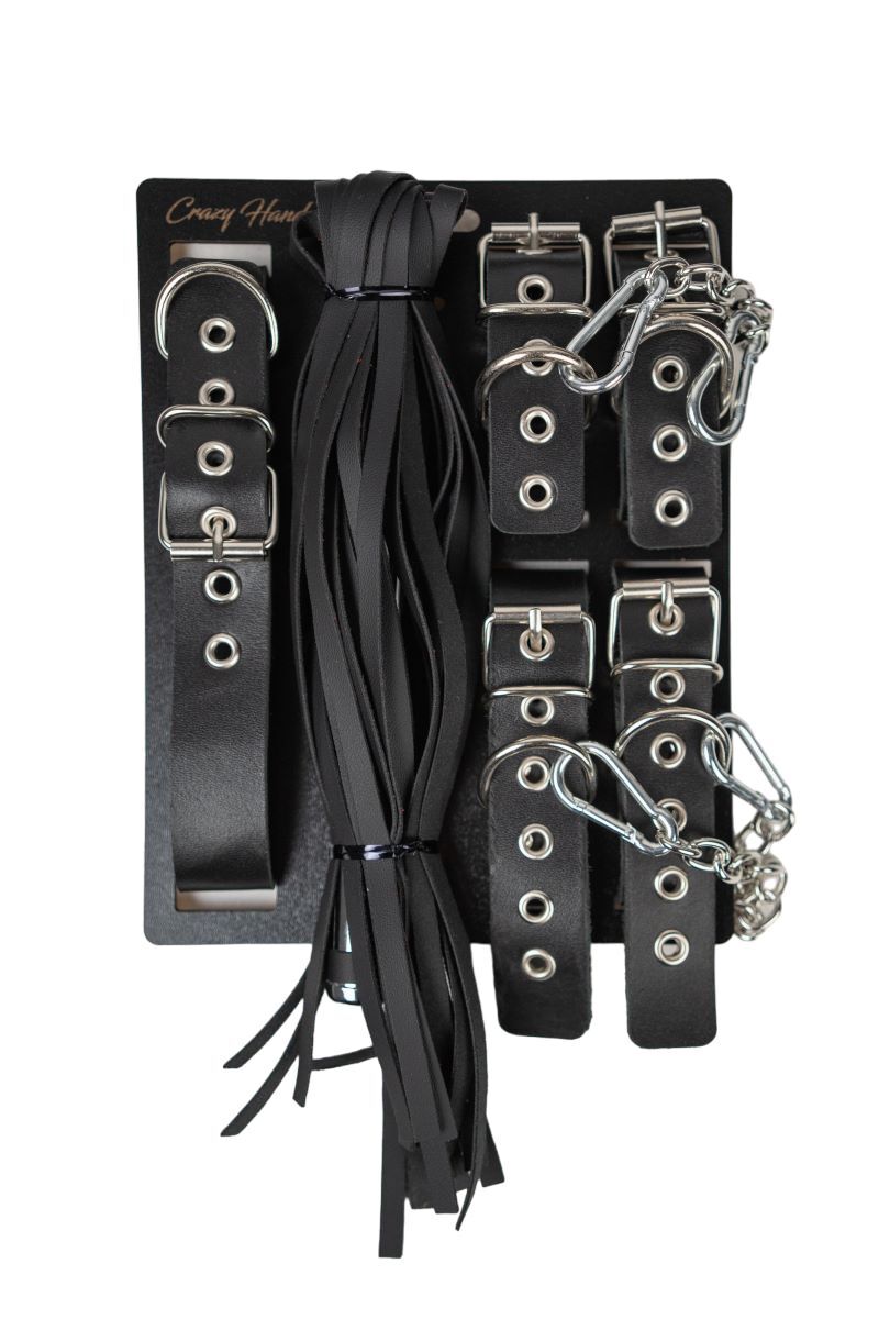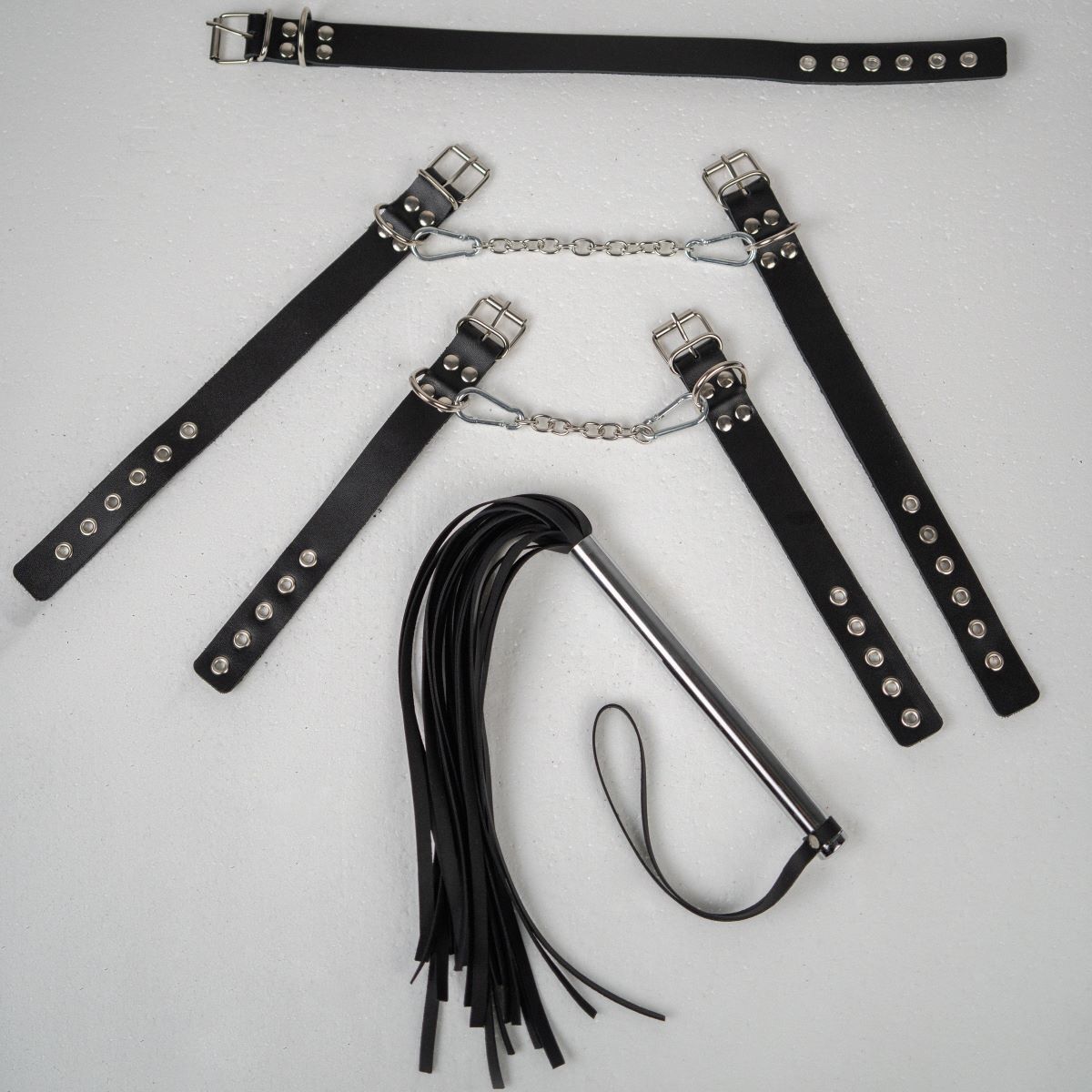 Этот набор для интимных игр выполнен из высококачественных материалов — натуральной кожи и хромированной фурнитуры ⛓️. Каждая деталь, от хлыстов плети до полукольца ошейника, продумана для комфорта и реалистичности. Ручка-петля на плети надежно зафиксирует ее на запястье, а соединительная цепочка с карабинами обеспечит гибкость в использовании наручников и оков.