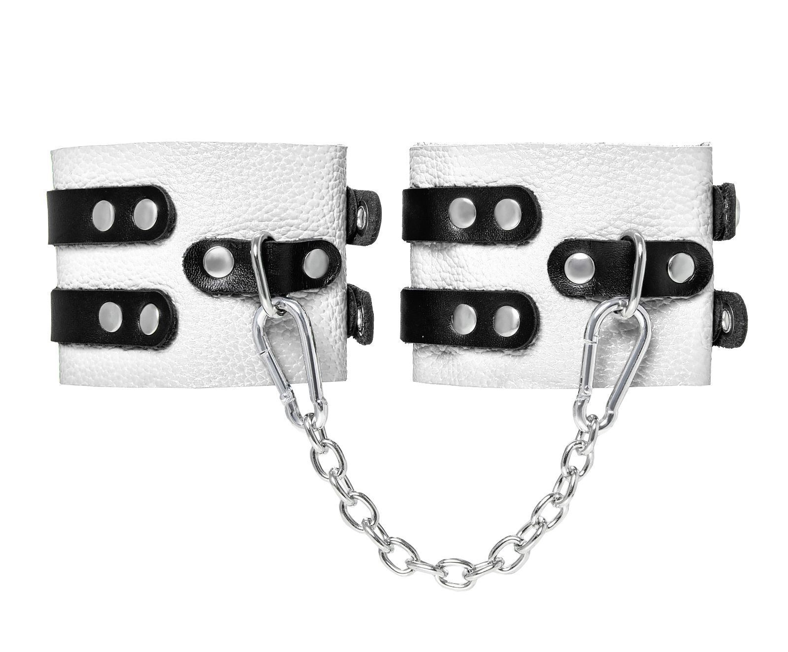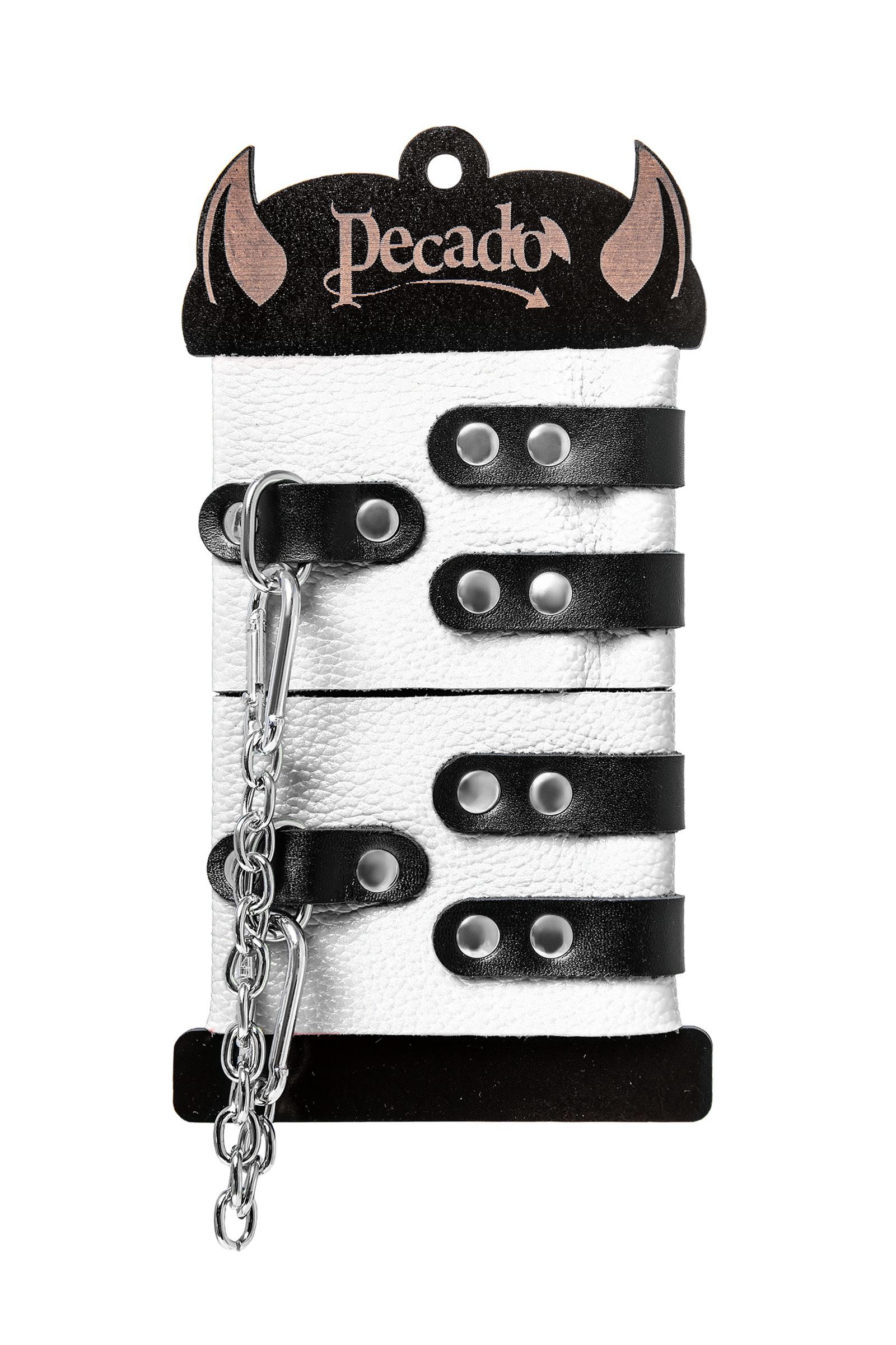 Мягкие оковы с двумя жёсткими ремешками от Pecado помогут обездвижить партнера во время сексуальных прелюдий или жестких БДСМ-играх. Оковы изготовлены полностью из белой, натуральной кожи. Ремешки выполнены из чёрной жёсткой кожи, украшены люверсами. Выделка материала произведена вручную. Ремешки и широкая манжета хорошо держат форму: не тянутся и не мнутся. Качественная металлическая фурнитура добавляет лоска изделию, а аромат натуральной кожи повышает градус возбуждения. Благодаря широкому запасу регулировок, можно подобрать необходимый обхват. Аксессуар удобно застегивать и легко расстегивать. При правильном использовании не оставляет следов на теле и не доставляет дискомфорта. Манжеты оков соединяются между собой помощью двух карабинов и съемной стальной цепочки. Подходит и для женских, и для мужских ног. Длина манжет - 25 см, ширина - 7 см.