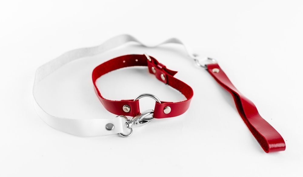 Сексуальный чокер с поводком, выполненный из натуральной кожи белого и красного цветов. Аксессуар декорирован двумя металлическими кольцами. Длина чокера удобно регулируется и отлично подойдет на обхват шеи от 30 до 40см. Яркий и комфортный в использовании аксессуар. Длина поводка - 60 см.