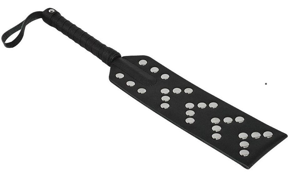 Шлепалка изготовлена из натуральной кожи и декорирована металлическими клёпками. Рабочая длина - 21 см.