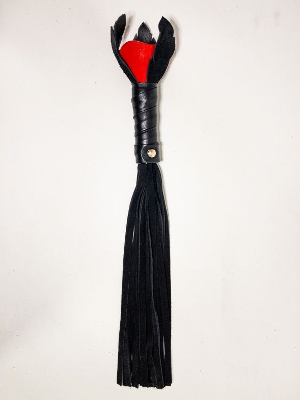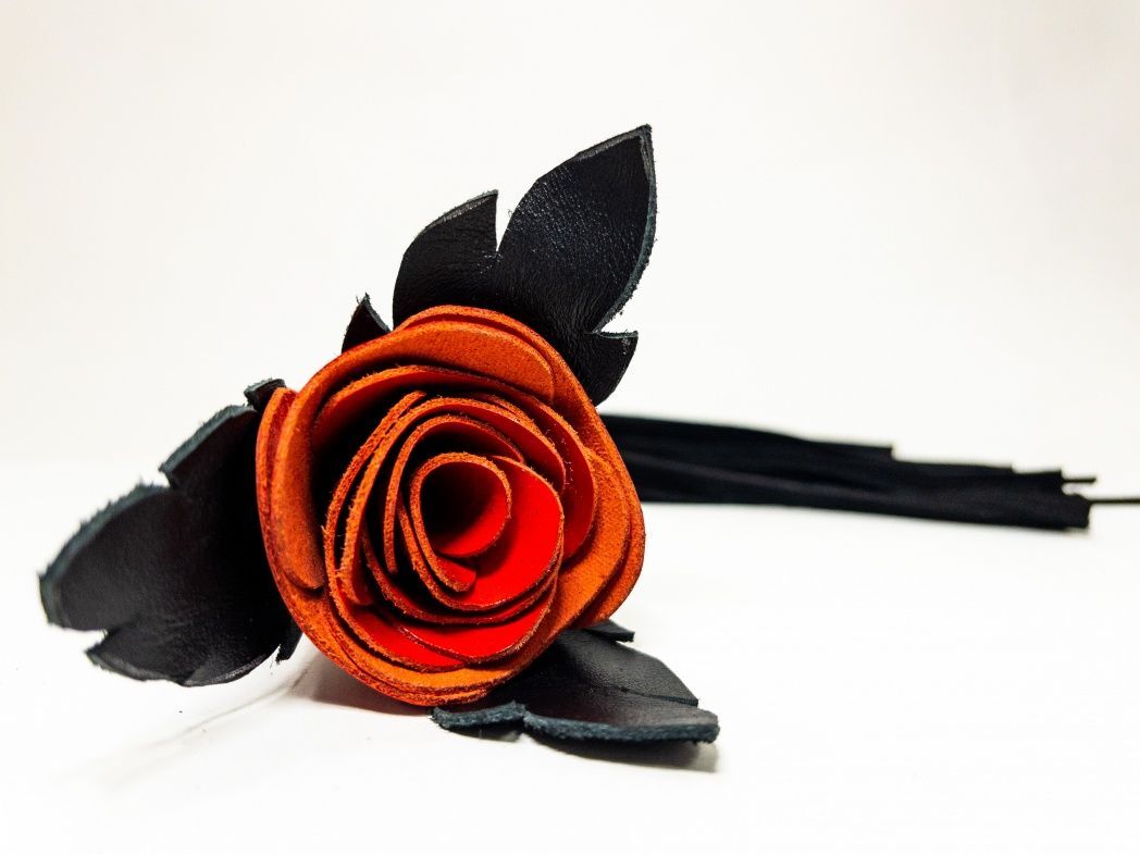 Восхитительная мини-плеть, украшенная красной розой. Цветок полностью выполнен из натуральной лаковой кожи, листочки розы и рукоятка выполнены из мягкой натуральной кожи, а хвосты плети - натуральная мягкая замша. Размеры этой плети очень изящны, поэтому данную плеть можно использовать, как генитальную, чтобы добавить новых ярких ощущений. Розочка очень удобно лежит в руке и создает неповторимую атмосферу и настроение, этот аксессуар никого не оставит равнодушным!