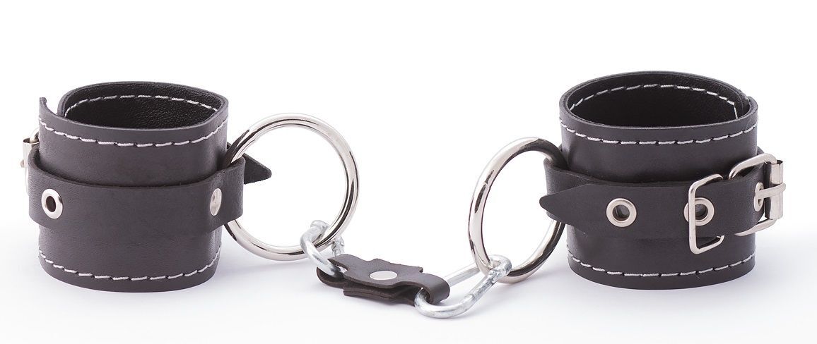 Кожаные двухслойные наручники имеют регулируемые застежки. Наручники имеют кольца для крепления и металлическую сцепку. Ширина манжет - 5,5 см.