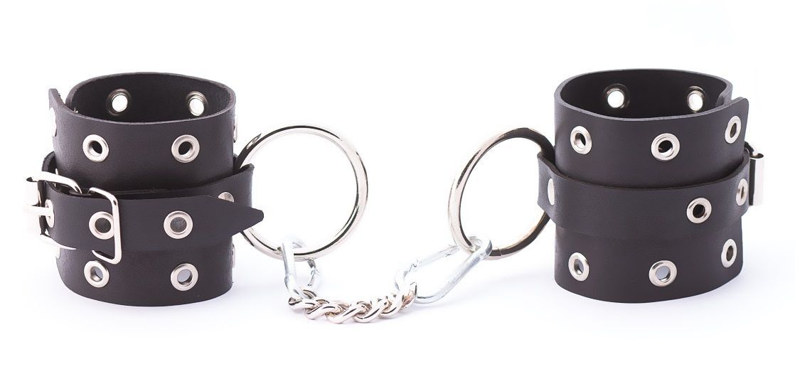 Кожаные однослойные наручники с люверсами. Наручники имеют кольца для крепления и металлическую сцепку. Ширина манжет - 6,5 см.