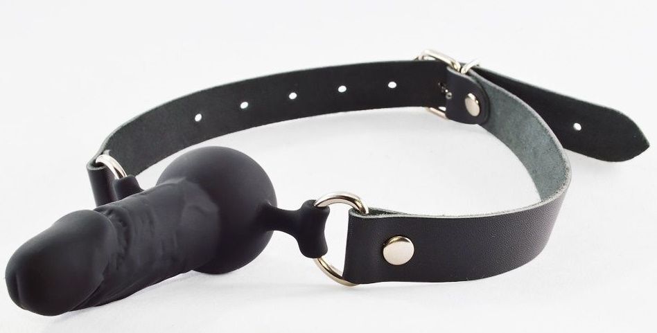 Силиконовый кляп в виде сферы и небольшого фаллоимитатора прикреплен к ремешкам из натуральной кожи. Регулируется кляп при помощи металлической пряжки. Металлическая фурнитура имеет никелевое покрытие. Ширина ремешков - 2 см.