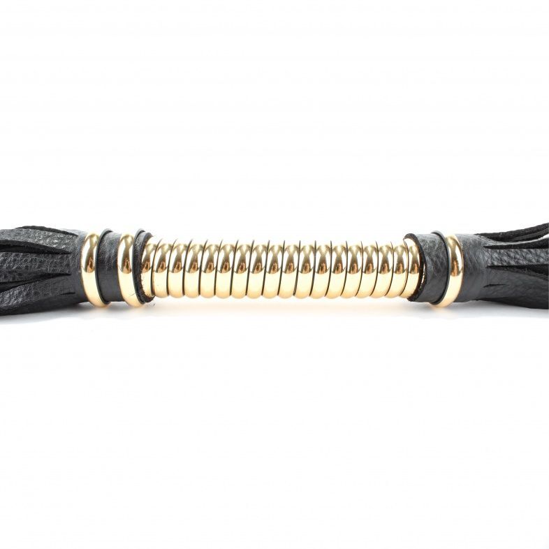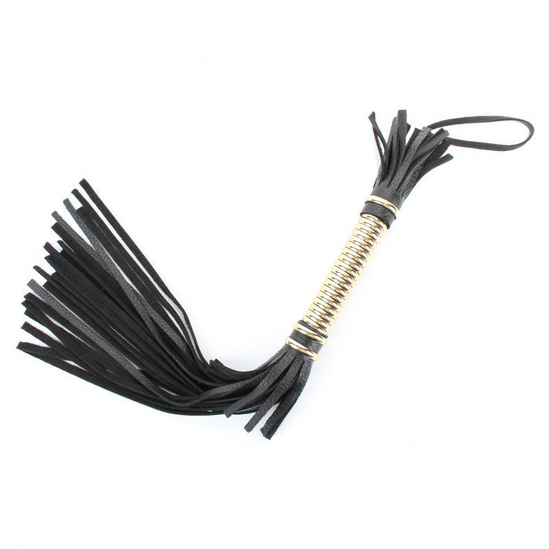 Плеть выполнена из натуральной кожи черного цвета. Стильная витая металлическая рукоятка золотого цвета и мягкие хвосты аксессуара доставят незабываемое впечатление, позволят партнерам воплотить самые сокровенные желания. Для удобства на верхней части рукоятки расположена петелька. Количество хвостов - 20 штук. Длина рукояти - 16 см.