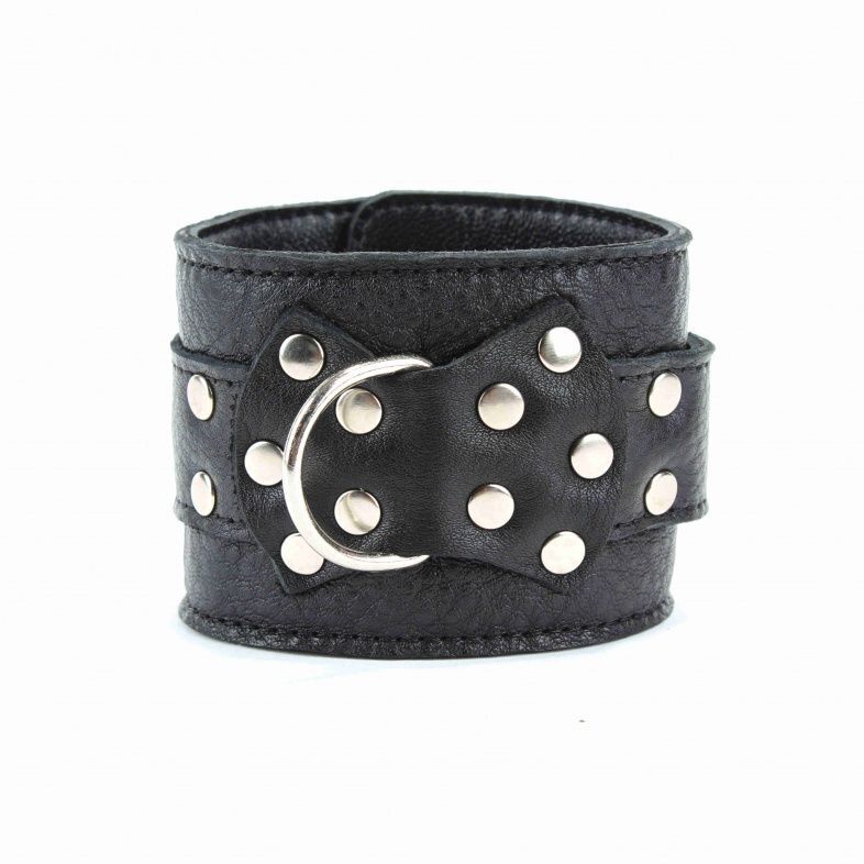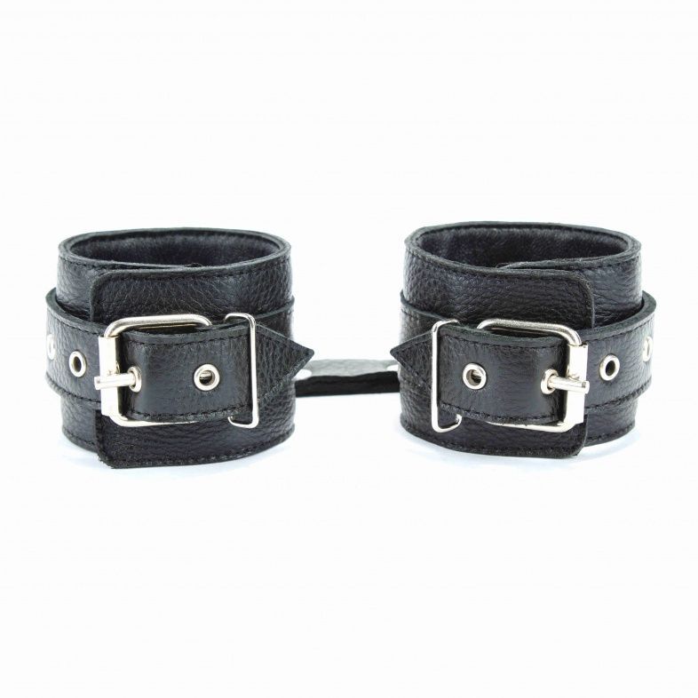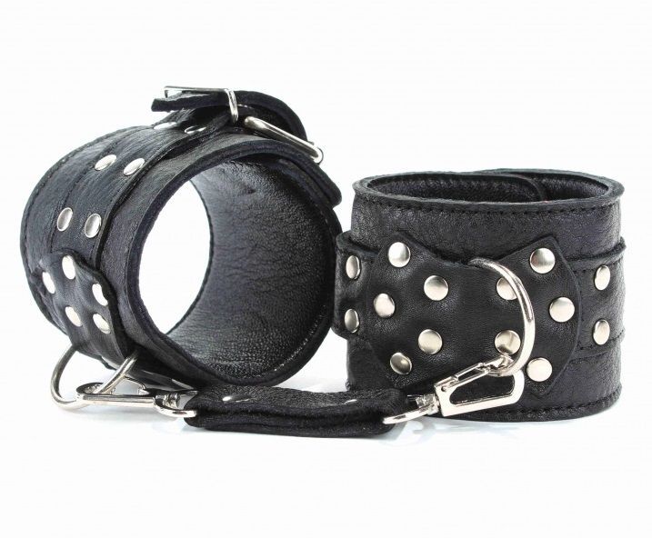 Оковы выполнены из натуральной кожи черного цвета. Декорированы заклепками и бантом с металлическим полукольцом. Оковы надежно фиксируются пряжками и ремнями, позволяющими выбрать нужный размер, подойдут на обхват от 18 до 27 см. Нежный подклад из перчаточной кожи обеспечивает комфорт, кожаное соединение на карабинах фиксирует оковы вместе. Аксессуар позволяет в полной мере насладиться сексом в стиле БДСМ. Ширина - 6 см.