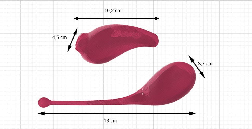 Длина виброяйца - 18 см., рабочая длина - 8 см.,диаметр - 3,7 см.