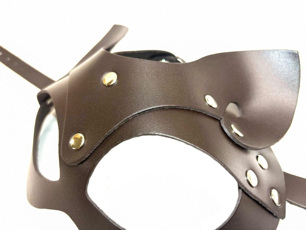 Восхитительная, сексуальная маска кошки. Выполнена из натуральной кожи в красивом шоколадном оттенке, удобно фиксируется с помощью пряжки, легко регулируется по размеру. Прекрасно держит форму благодаря плотной качественной коже. Идеально подходит под любую форму головы, подчёркивая глаза. Эта маска поможет Вам создать яркий, игривый образ страстной кошечки.