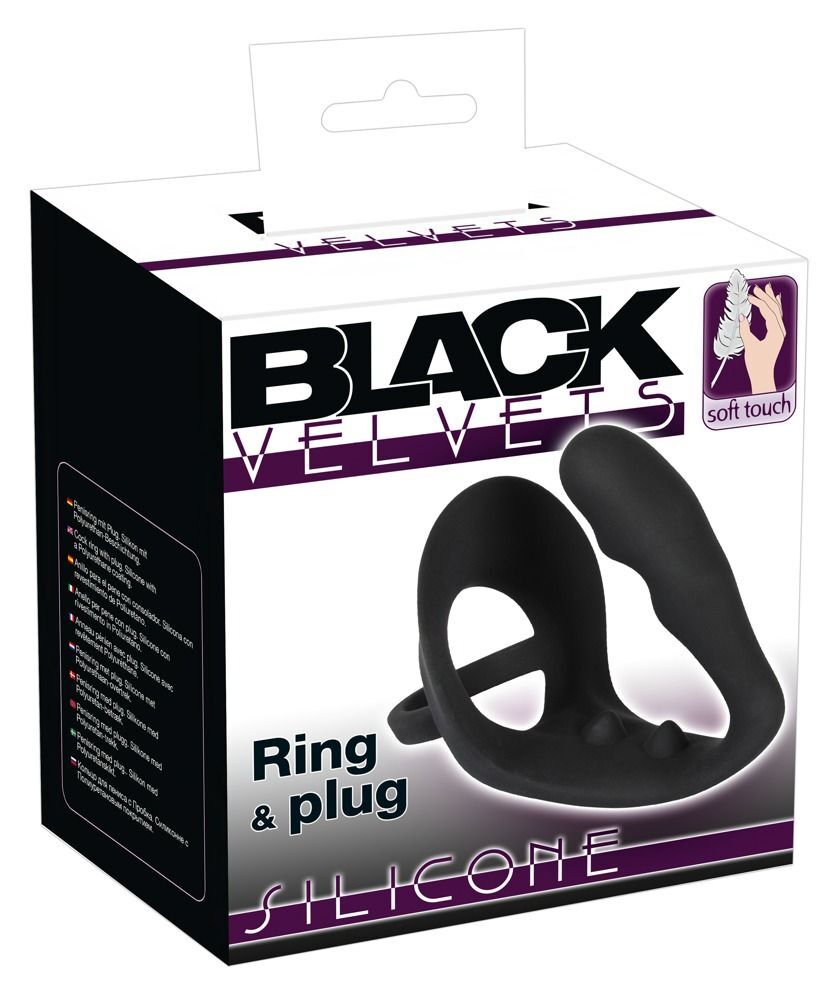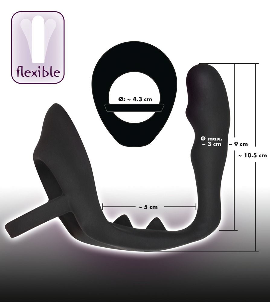 Эрекционное кольцо с подхватом мошонки и анальным отростком для воздействия на простату. Гибкое, выполнено из силикона. Длина перемычки - 5 см.