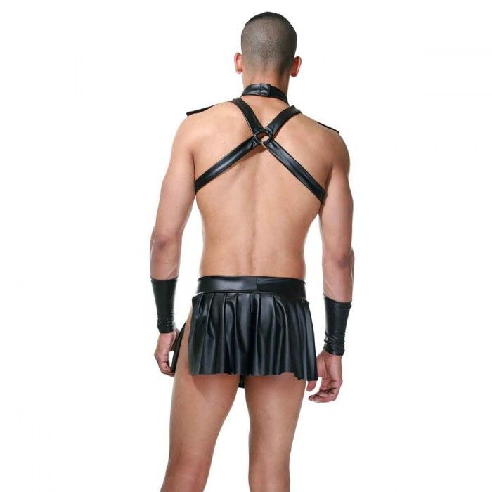 Тематический костюм гладиатора для мужчин, состоящий из четырех предметов: кожаное бюстье на грудь и плечи, юбка и напульсники-рукава. В комплекте: бюстье, юбка, напульсники.