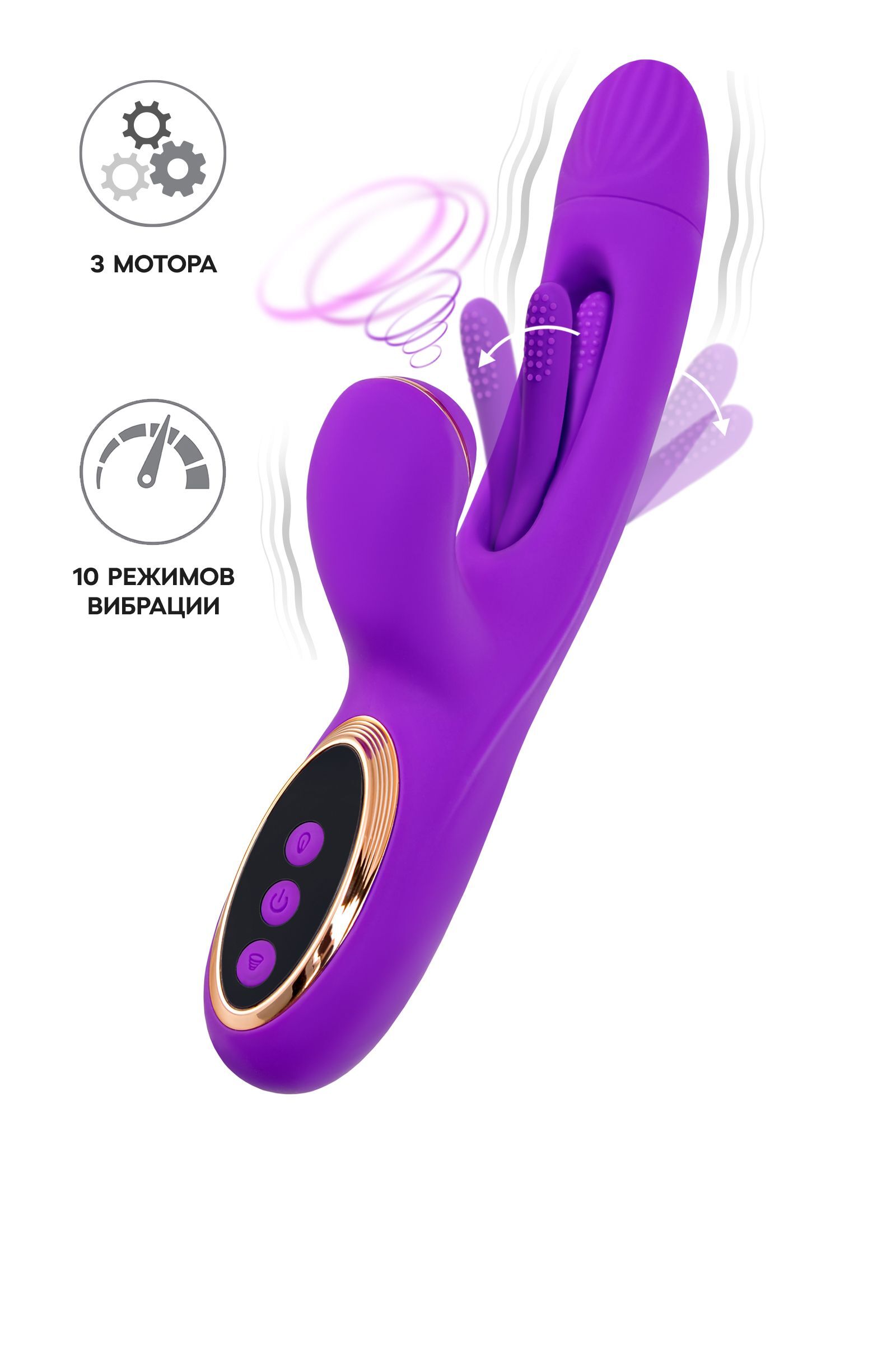 Тройное удовольствие гарантирует оргазм с максимальным уровнем экстаза. Управляйте своим наслаждением с легкостью! Три кнопки на основании вибратора контролируют каждый аспект удовольствия. Серединная кнопка включает устройство и переключает режимы основного вибратора. Кнопки ниже управляют режимами клиторального отростка. Верхняя кнопка изменяет режимы работы язычка.