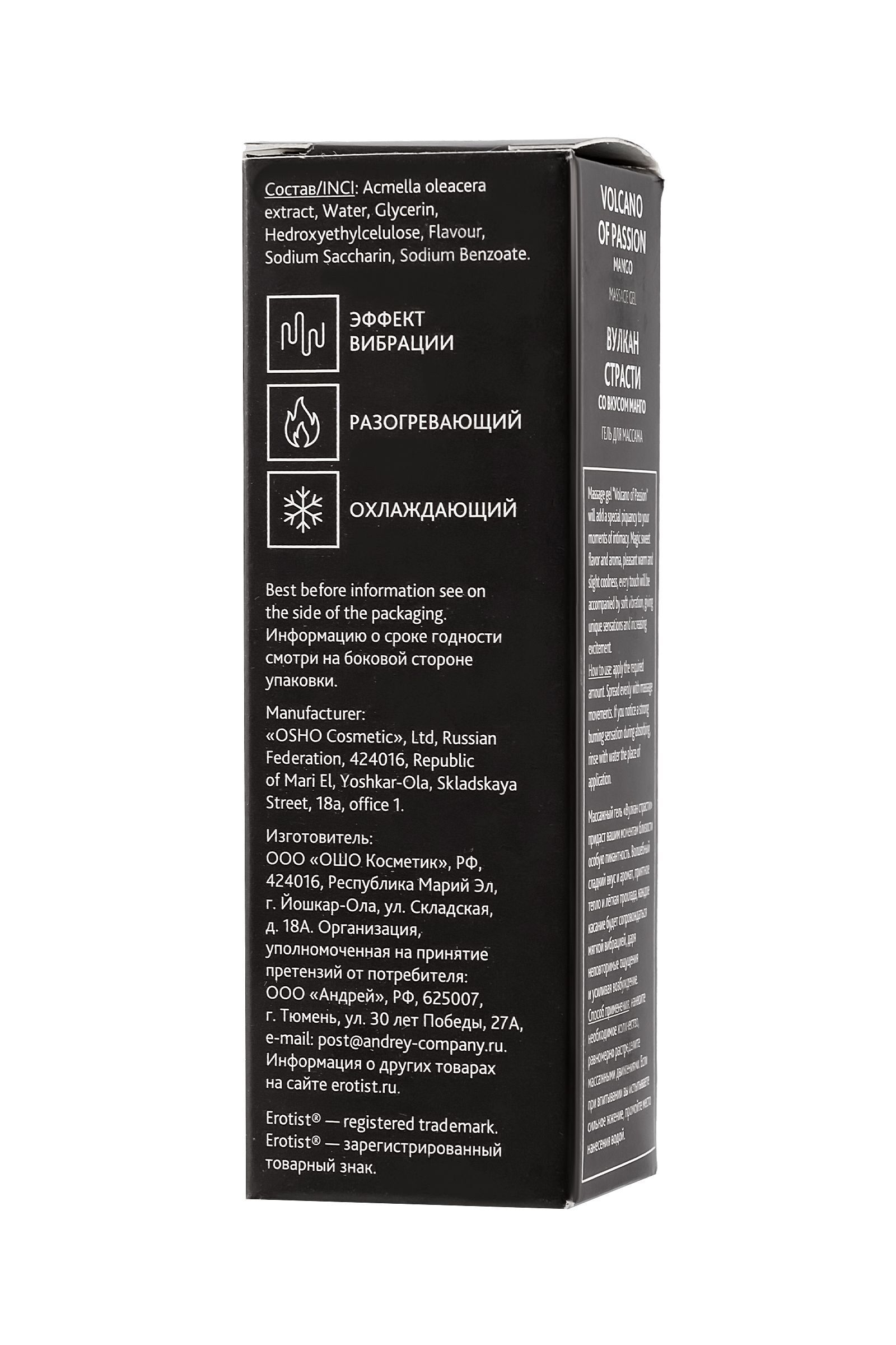 Массажный гель «Вулкан страсти» придаст вашим моментам близости особую пикантность. Волшебный сладкий вкус и аромат, приятное тепло и лёгкая прохлада, каждое касание будет сопровождаться мягкой вибрацией, даря неповторимые ощущения и усиливая возбуждение. Нанесите немного жидкого геля на интимные зоны, и через несколько секунд вы почувствуете тепло, затем в течение 2-3 минут легкую вибрацию и легкий холодок. Длительность эффекта зависит от особенностей вашего организма. Гель с вибрирующим эффектом для интимных зон на основе натуральных ингредиентов, без парабенов. Вкус и аромат манго. Подходит для поцелуев и орального секса.