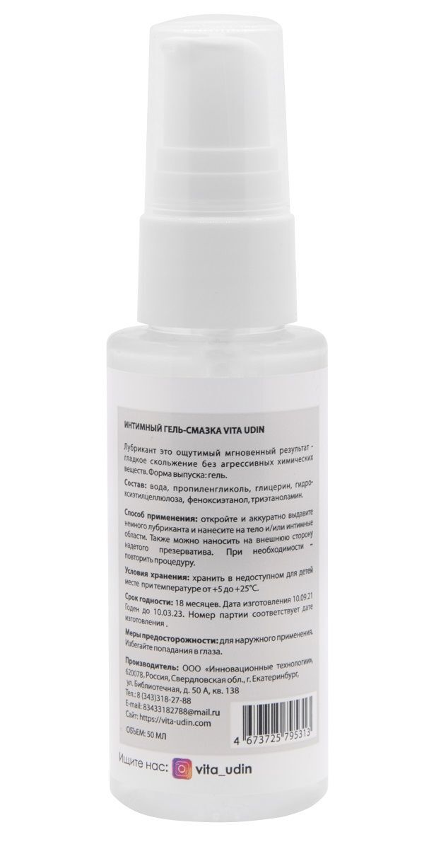 Лубрикант для влюблённых VITA UDIN принесёт яркое наслаждение и максимум удовольствия. Интимный гель-смазка добавит в ваши отношения нотку лёгкости и страсти. Не имеет отталкивающего резкого запаха. Смазка на водной основе, соответственно, не оставляет следов на белье, одежде и смывается обычной водой. Не доставит вам никаких дополнительных неудобств!