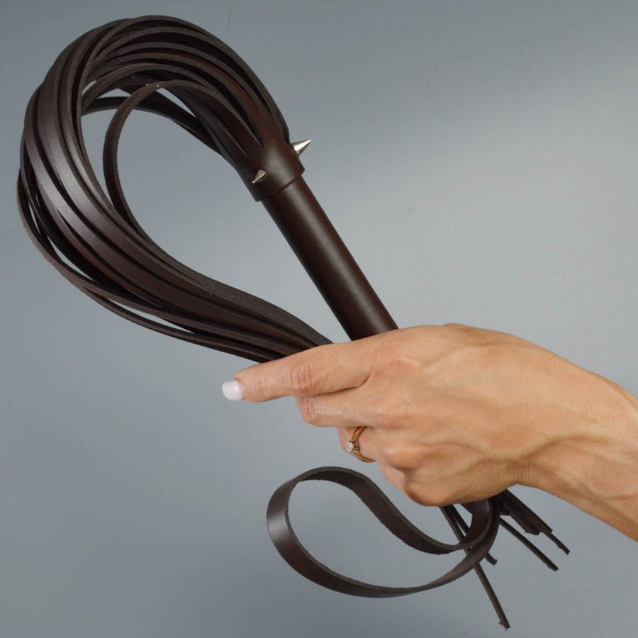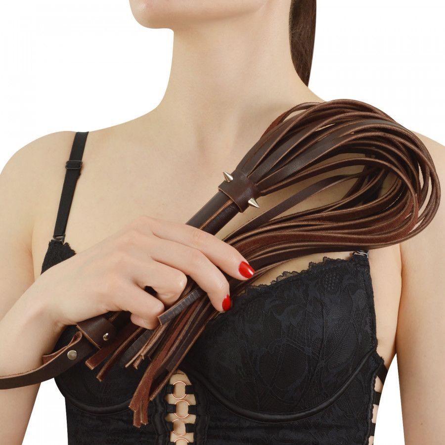 Эта плеть — воплощение страсти и изыскания. Натуральная коричневая кожа невероятно приятна на ощупь — мягкая, но при этом достаточно плотная для создания нужного эффекта. Три шипа из металла добавляют игре ощутимую остроту. Длина в 55 см позволяет легко контролировать силу и направлять энергию 🔥.