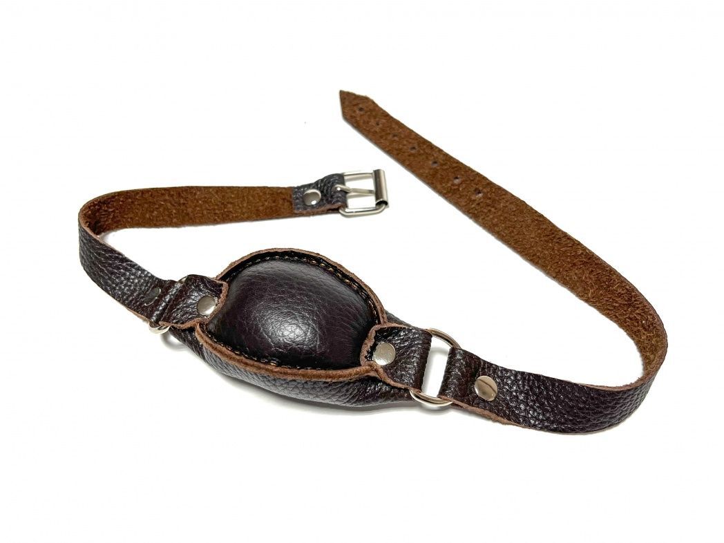 Качественный и удобный кляп, выполненный из натуральной кожи коричневого цвета. Благодаря наполнителю средней жесткости этот кляп будет комфортен в использовании. Аксессуар декорирован сварной металлической фурнитурой. Обхват удобно регулируется с помощью металлической пряжки. Отличный аксессуар для любовной игры и новых ощущений! Размер кляпа - 9 х 5 см.