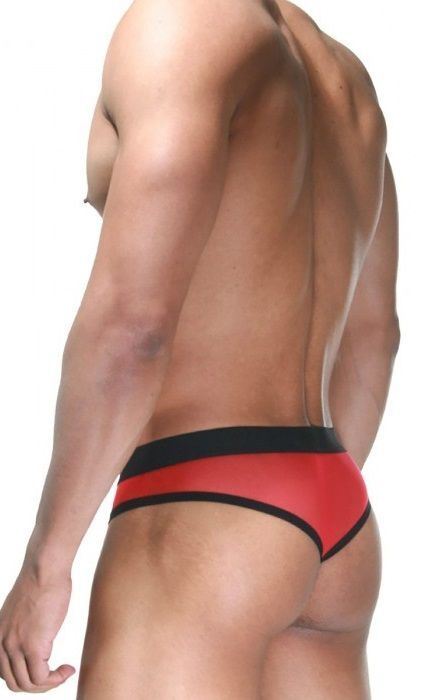 Мужские тонги из красной полупрозрачной ткани, с черным кантом и на широком черном поясе.