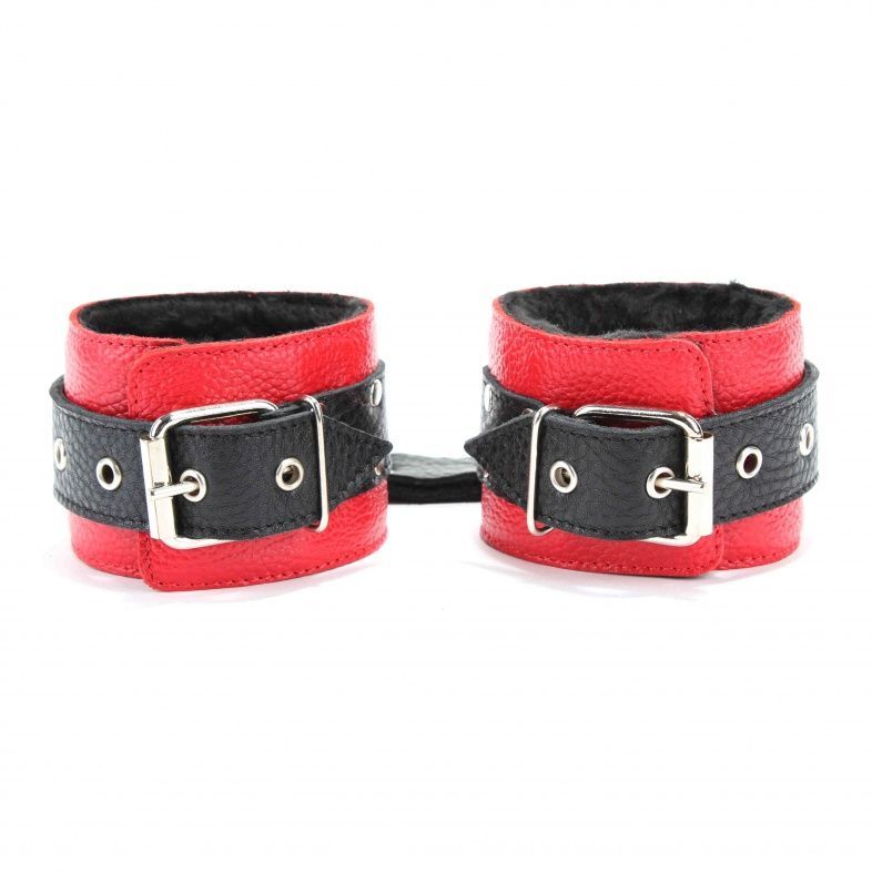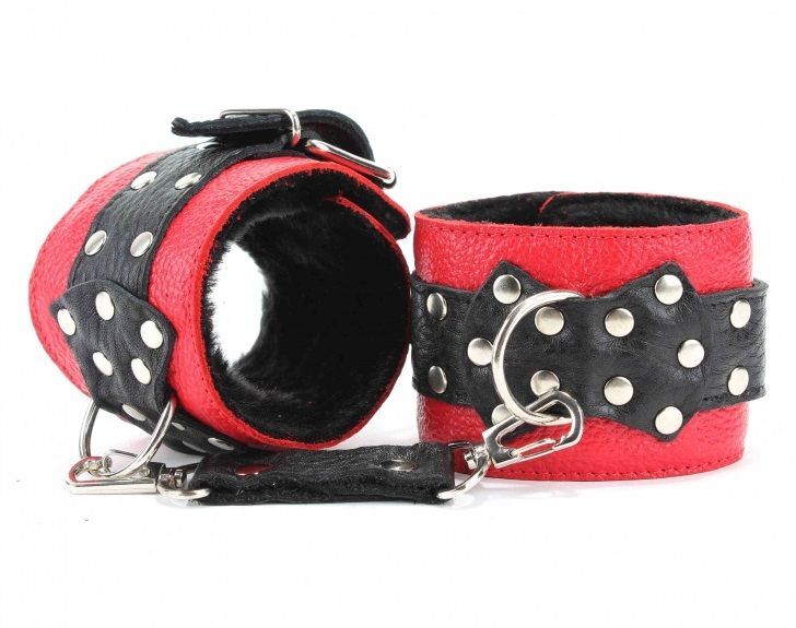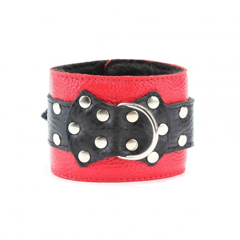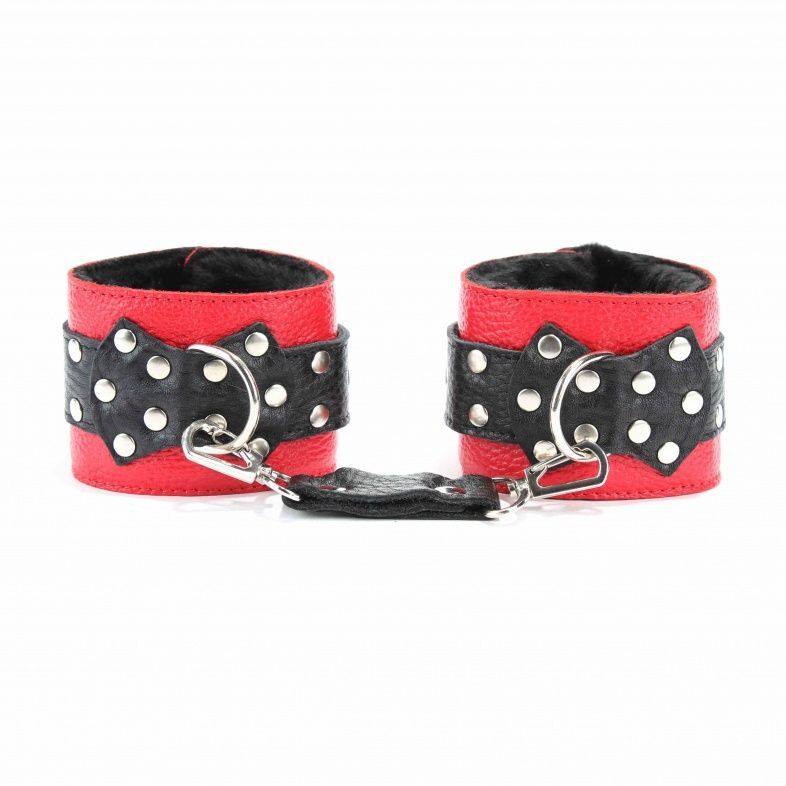 Наручники выполнены из красной натуральной кожи, с ремнями из черной кожи. Аксессуар украшен металлическими заклёпками и декором в виде банта. Металлическая пряжка крепко удерживает в подчинении, кожаное соединение на карабинах фиксирует наручники вместе. Ремни позволяю выбрать нужный размер, подойдут на обхват руки от 16 до 26 см. Мягкий подклад из черного меха обеспечивает комфорт, помогая полностью погрузиться в БДСМ игру. Ширина - 6 см.