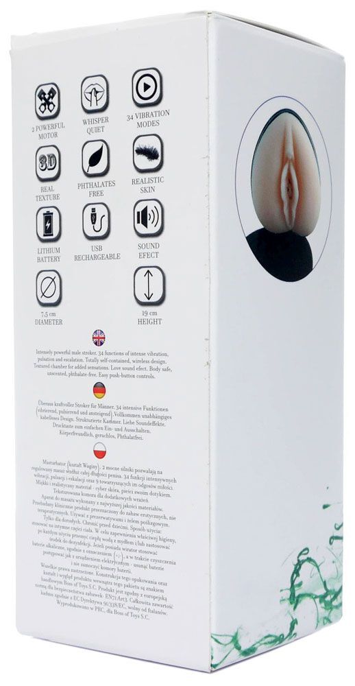 Мастурбатор-вагина в колбе. 2 мощных двигателя позволяют регулировать массаж по всей длине пениса. Имеет 35 интенсивных функций вибрации, пульсации и стимуляции. Зарядка осуществляется с помощью USB.