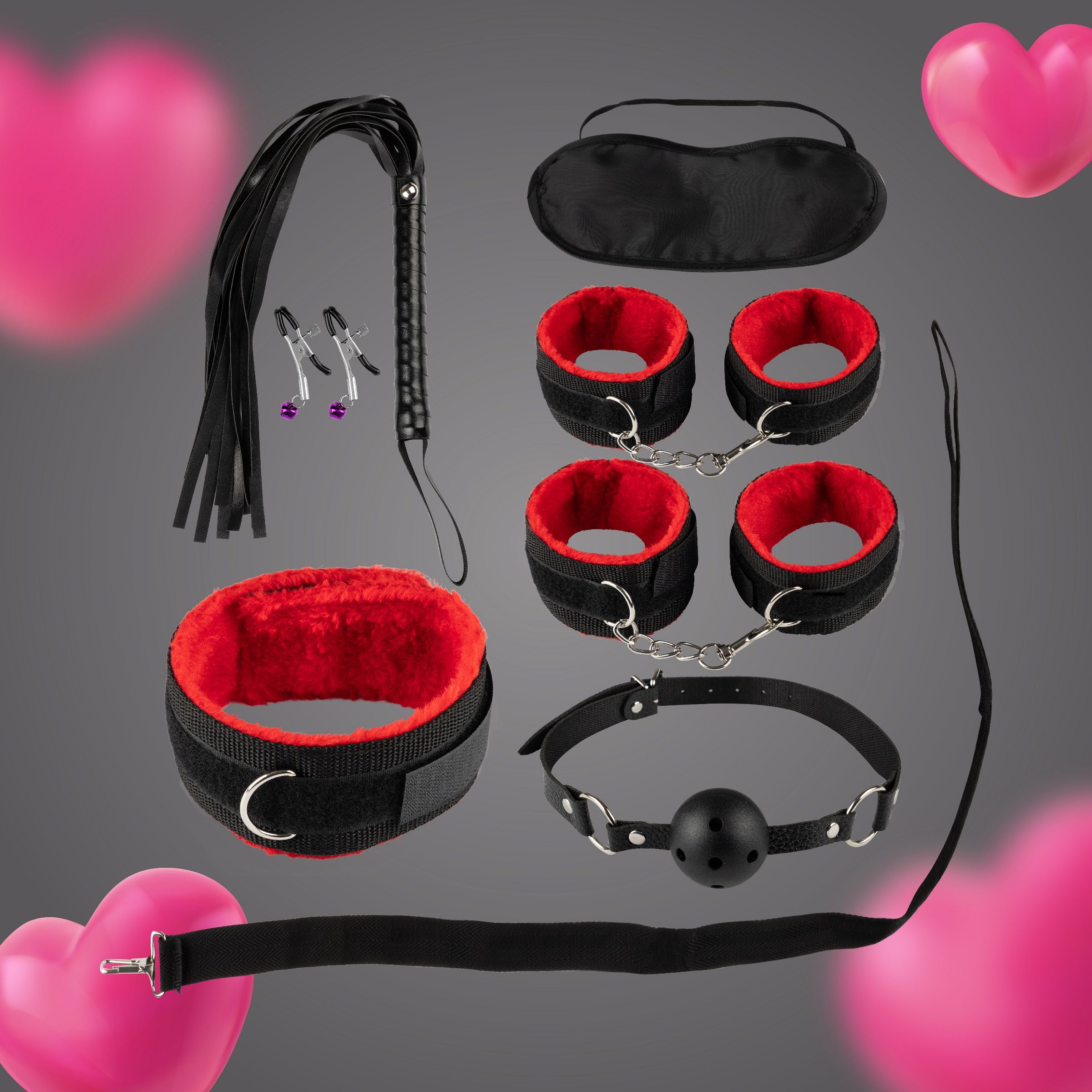 В набор входят 2 пары кожаных наручников с мехом (для рук и ног), 1 ошейник меховой с поводком, 1 кляп-шар, 1 маска для глаз, 1 плеть-флогер, 2 зажима для сосков. Итого 8 предметов для смелых экспериментов в спальне. Комплект выполнен из прочной эко-кожи практичного черного цвета с красной отделкой и совершенно неприхотлив в уходе.