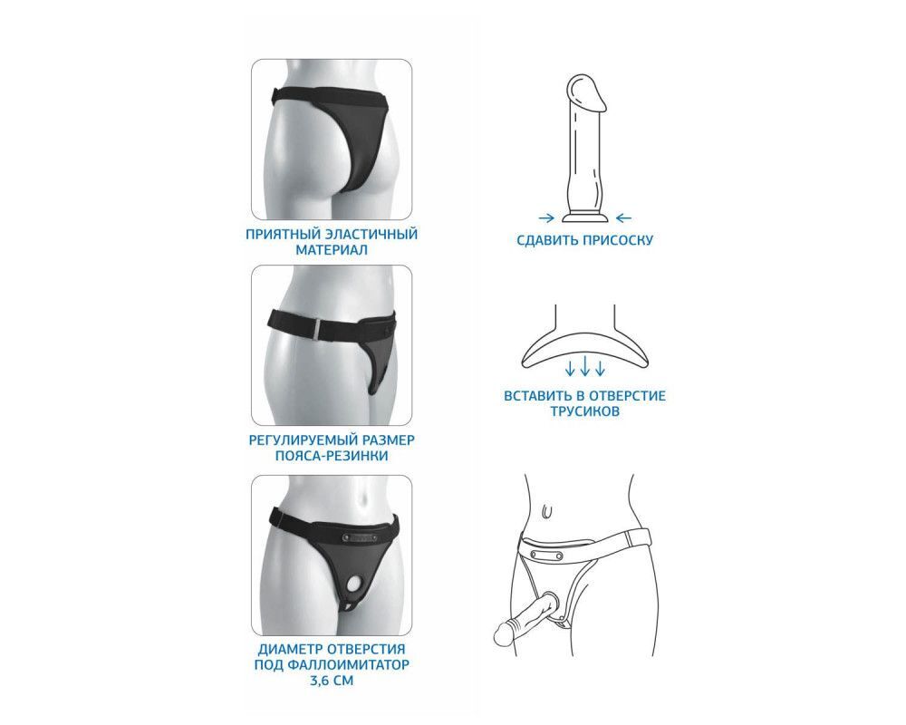 Насадка-фаллоимитатор имеет реалистичную рельефную форму и обладает эффектом мягкой текстуры кожи. В изделии использован эффект двойной структуры: более твердая основа фаллоимитатора покрыта слоем мягкого материала Polyskin, который произведен из немецкого сырья. Размер трусов - S-L.