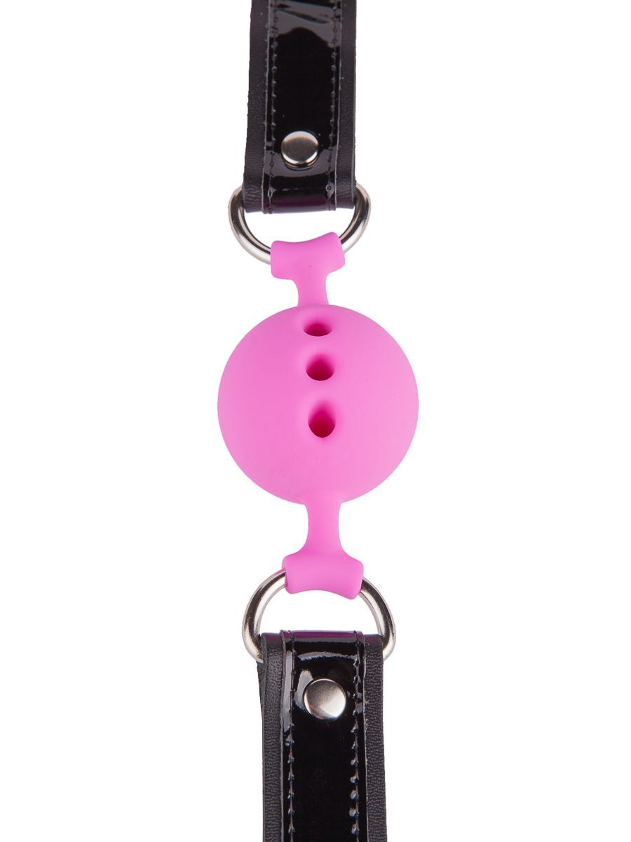 Кляп с оригинальным кожаным ремешком и лаковыми вставками черного цвета. Сам кляп-шар изготовлен из силикона в розовом исполнении, приятного на ощупь, со специальными отверстиями, пропускающими воздух.