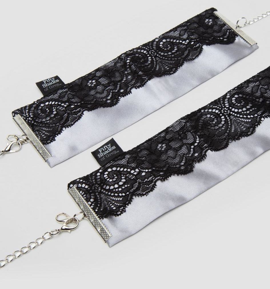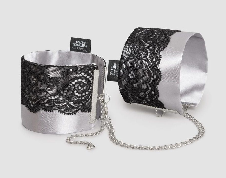 Переливающиеся серебристые манжеты-наручники с нежной черной кружевной отделкой. Комфортно ощущаются даже на самой нежной коже. Деликатно, но надежно удерживают руки. Обеспечивает высокий комфорт при длительном ношении.
