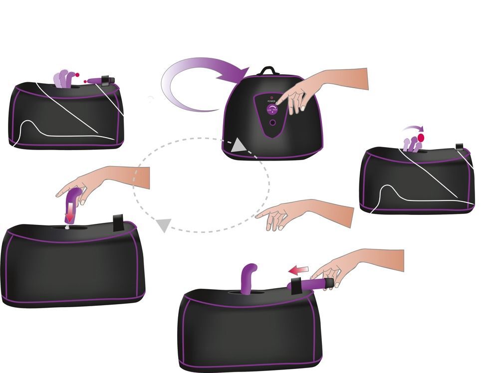 В комплекте с вибратором идут 2 насадки - с шипами и с изогнутым кончиком для массажа G-точки. Может использоваться мужчиной для анальной стимуляции. Размеры машины - 37 х 27 х 18 cm.