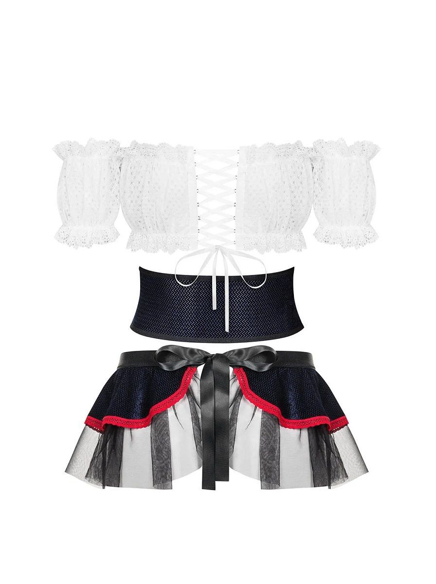 Соблазнительный костюм славянки состоит из пяти частей. Полупрозрачный топ-бюстгальтер с принтом в мелкий горошек, на спинке очаровательная шнуровка. Два коротких рукава, которые не соединены с топом. Широкий пояс с красной шнуровкой. Короткая юбка с рюшами очень кокетливо ниспадает на бедра, сзади завязывается на атласные ленты. В комплекте: топ-бюстгальтер, 2 рукава, пояс, юбка, трусики-стринги.