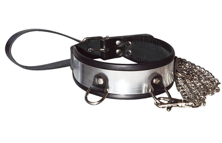 Ошейник изготовлен из высококачественной кожи черного цвета. По краю изделия проходит оторочка, обеспечивающая комфортное использование. Особенностью данной модели является вставка, имитирующая металл, которая придаёт изделию эффектности. Отрегулировать размер ошейника можно при помощи металлической пряжки. Вся металлическая фурнитура имеет никелевое покрытие. Ширина - 4 см.