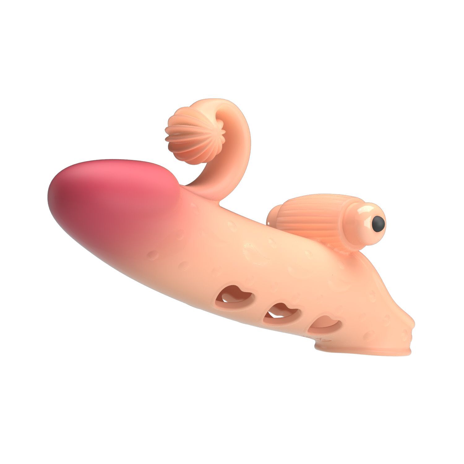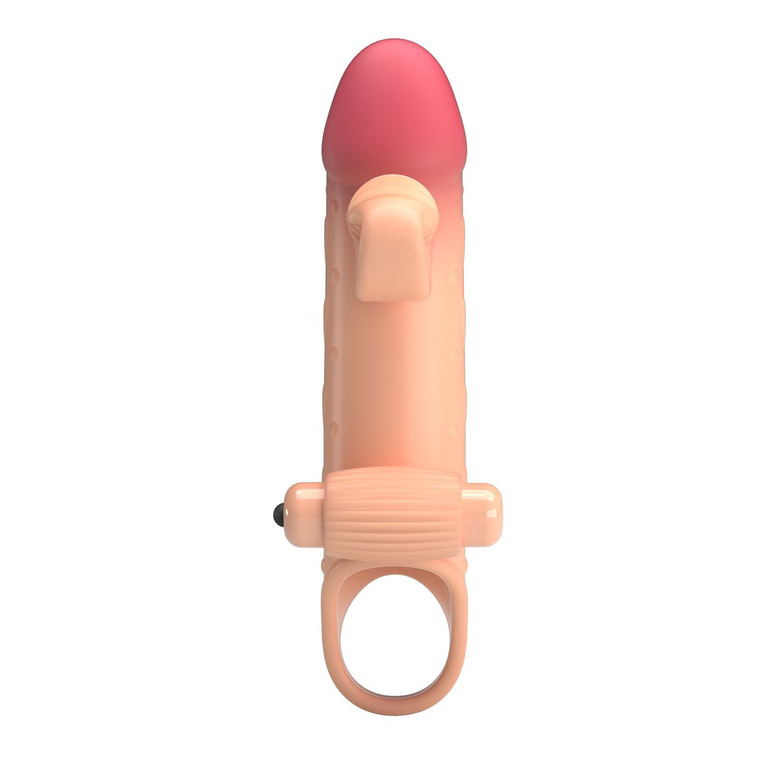 Телесная вибронасадка на пенис с подхватом мошонки. Насадка удлиняет член, добавляет ему толщины. Обеспечивает партнёрше массаж клитора при глубоких проникновениях.