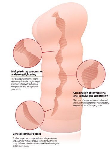 Отверстие с 6 узкими перемычками идеально имитирует анальное отверстие. Она дает ощущения очень тесного сжатия и вакуума. Шесть плотных колец TONG GGO эффективно стимулируют пенис, а виброрпуля придаёт дополнительную стимуляцию. Этот мастурбатор можно назвать самым популярным среди всех мастурбаторов, имитирующих анальный секс - за счет своей ультра-реалистичной внутренней структуры с упругими перемычками и V-образными ребрышками.
