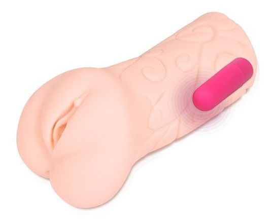 Крупный мастурбатор с узорами на внешней стороне, рельефной точкой G, вибропулю, складками и тремя шариками для стимуляции головки пениса.