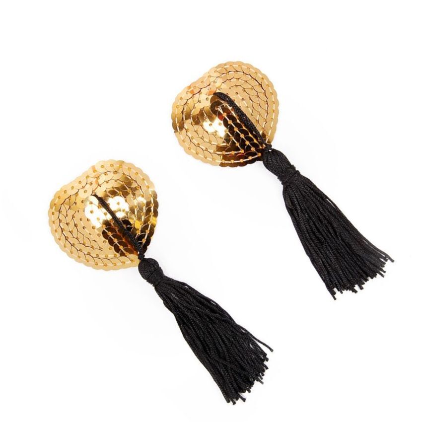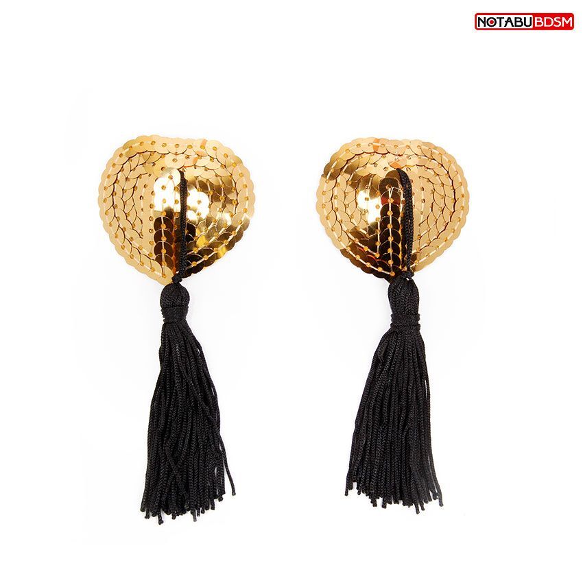Хотите добавить изюминку в любовную игру? В этом вам помогут оригинальные пэстисы в форме сердца с игривыми кисточками. Золотистые, красиво переливающиеся на свету, они украсят соски, сделав грудь привлекательной и манящей. Внешняя сторона изделий отделана пайетками. На внутренней же имеется специальный силиконовый слой, за счёт которого аксессуары держатся на сосках.